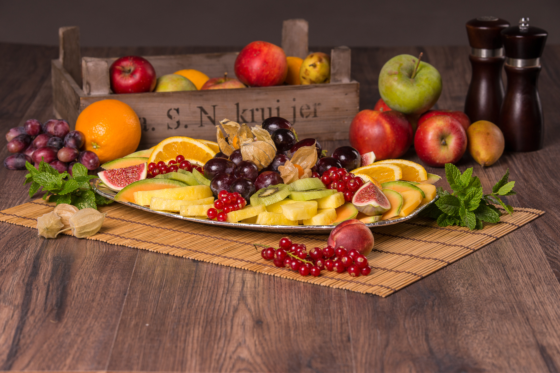 Mundfertig geschnittenes Obst der Saison ansprechend auf einer Platte garniert: