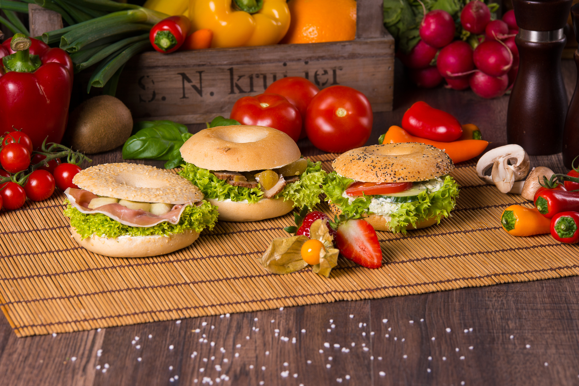 Bagel belegt mit:Bulette mit Apfel-Zwiebel-Chutney ∙ Hähnchenbrust mit Erdbeer-Ingwer-Chutney ∙ Räucherlachs mit Dill-Senf-Sauce und Gurke ∙ Serrano-Schinken mit Mango-Chutney ∙hausgemachter Schafskäsecreme mit Tomate, Gurke und Paprika