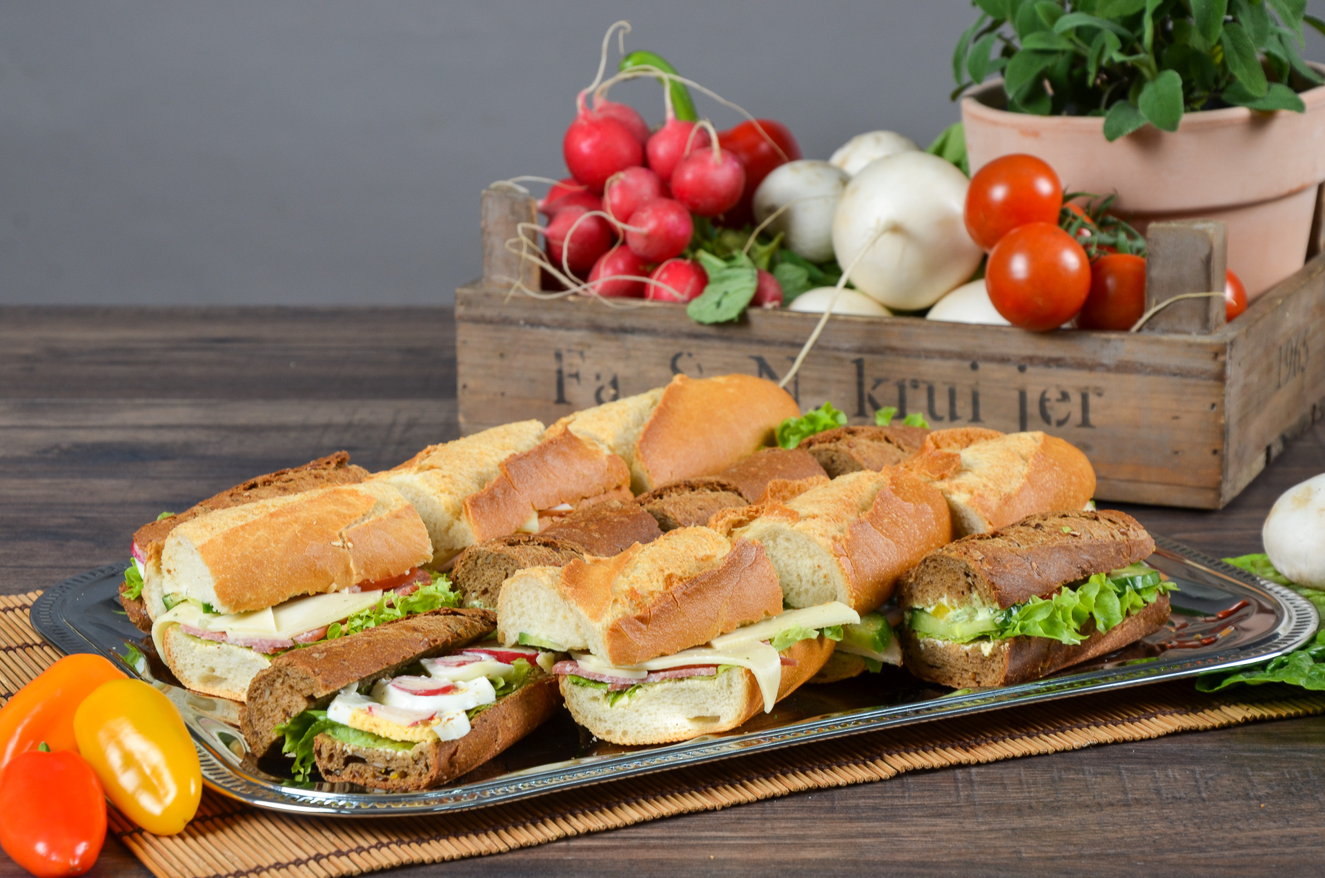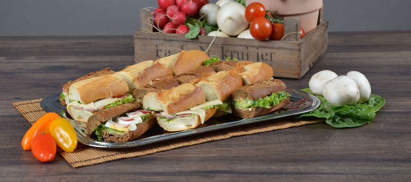 Salami und Gouda ∙ Kochschinken und Gouda · Ei ∙ SchafskäsecremeDekoriert mit Salat und frischem Gartengemüse der Saison.