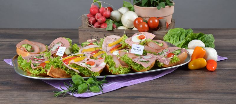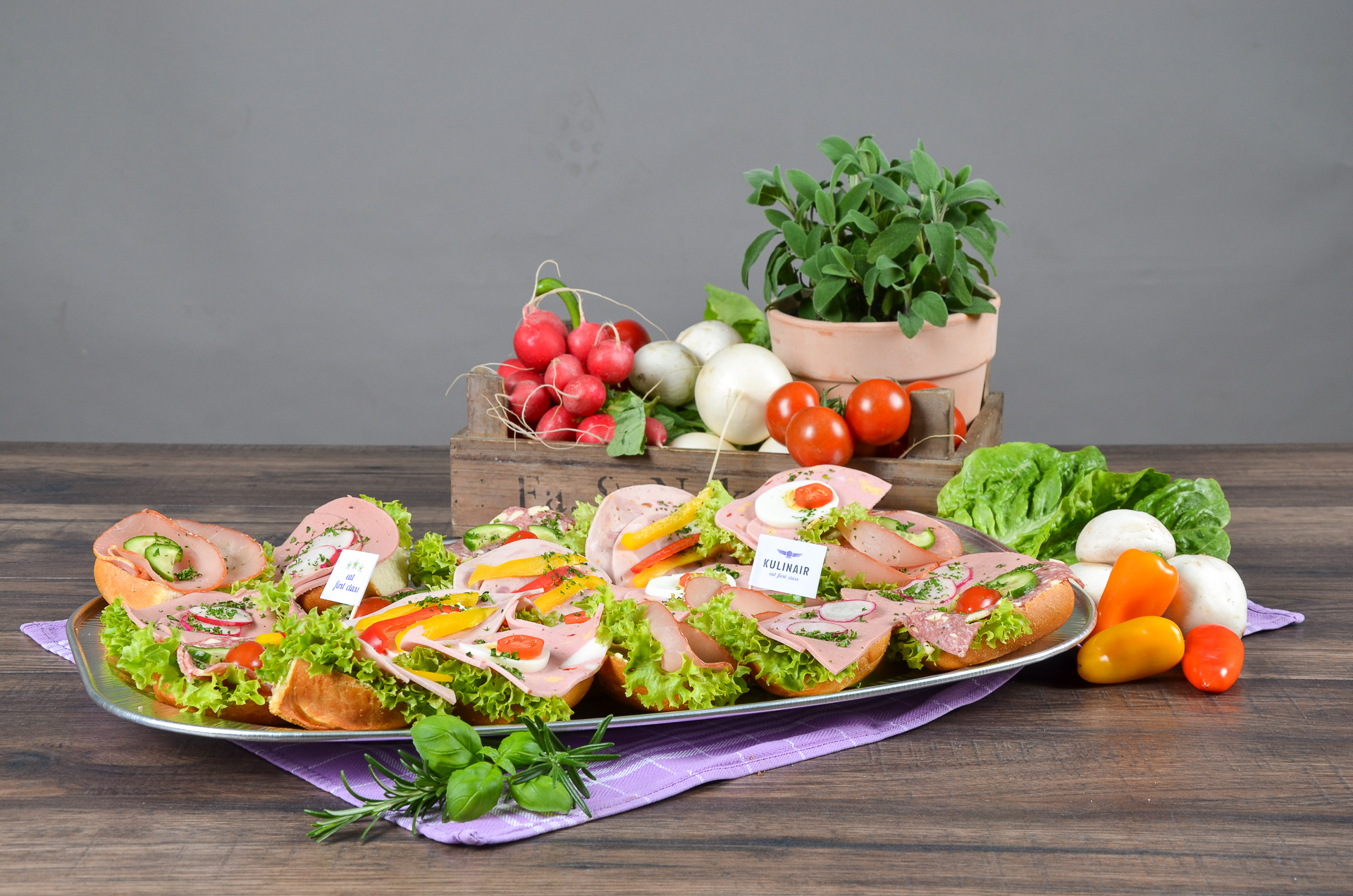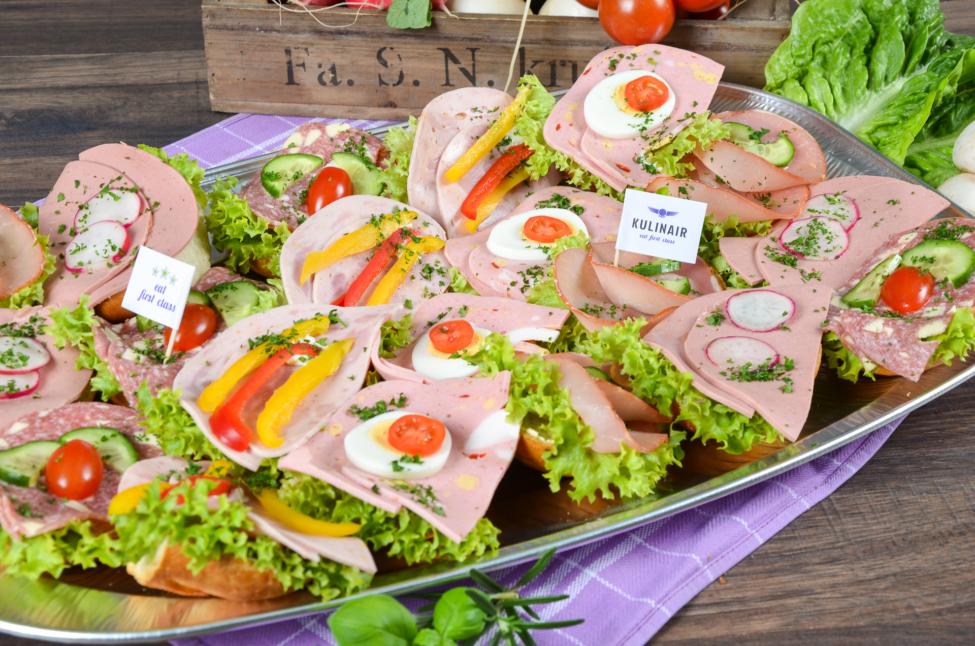 Bierschinken ∙ Sächsischer Leberkäse ∙ Hausssalami · Kassler ∙ Lachsschinken in Fleischerqualität, garniert mit frischen Obst und Gemüse