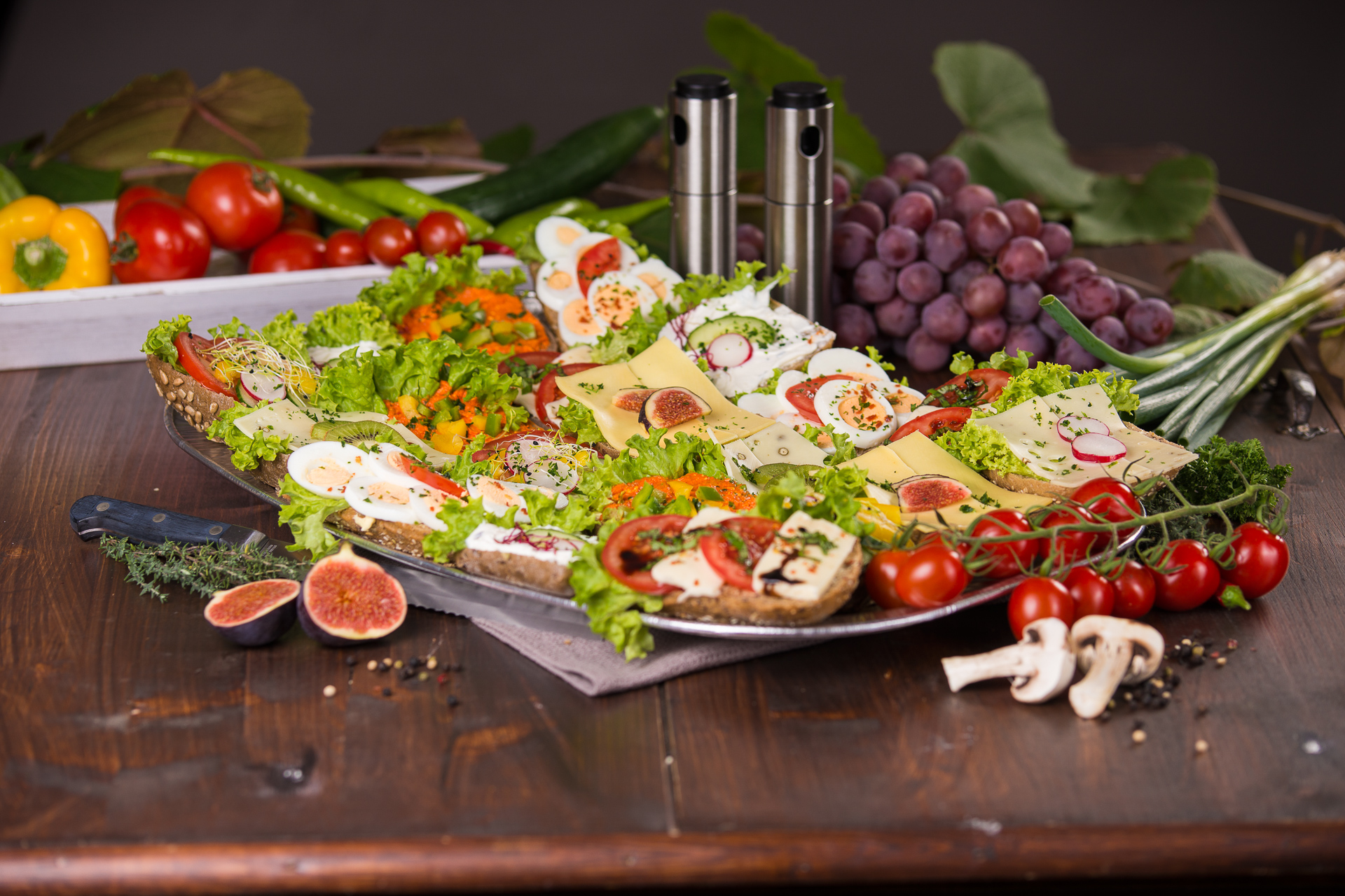 Tomate-Mozzarella ∙ Gouda ∙ Kräuterschnittkäse ∙ Ei ∙ Camembert∙ Kräuterquark ∙ würziger hausgemachter SchafskäsecremeDekoriert mit Salat, frischem Gartengemüse und Obst der Saison.