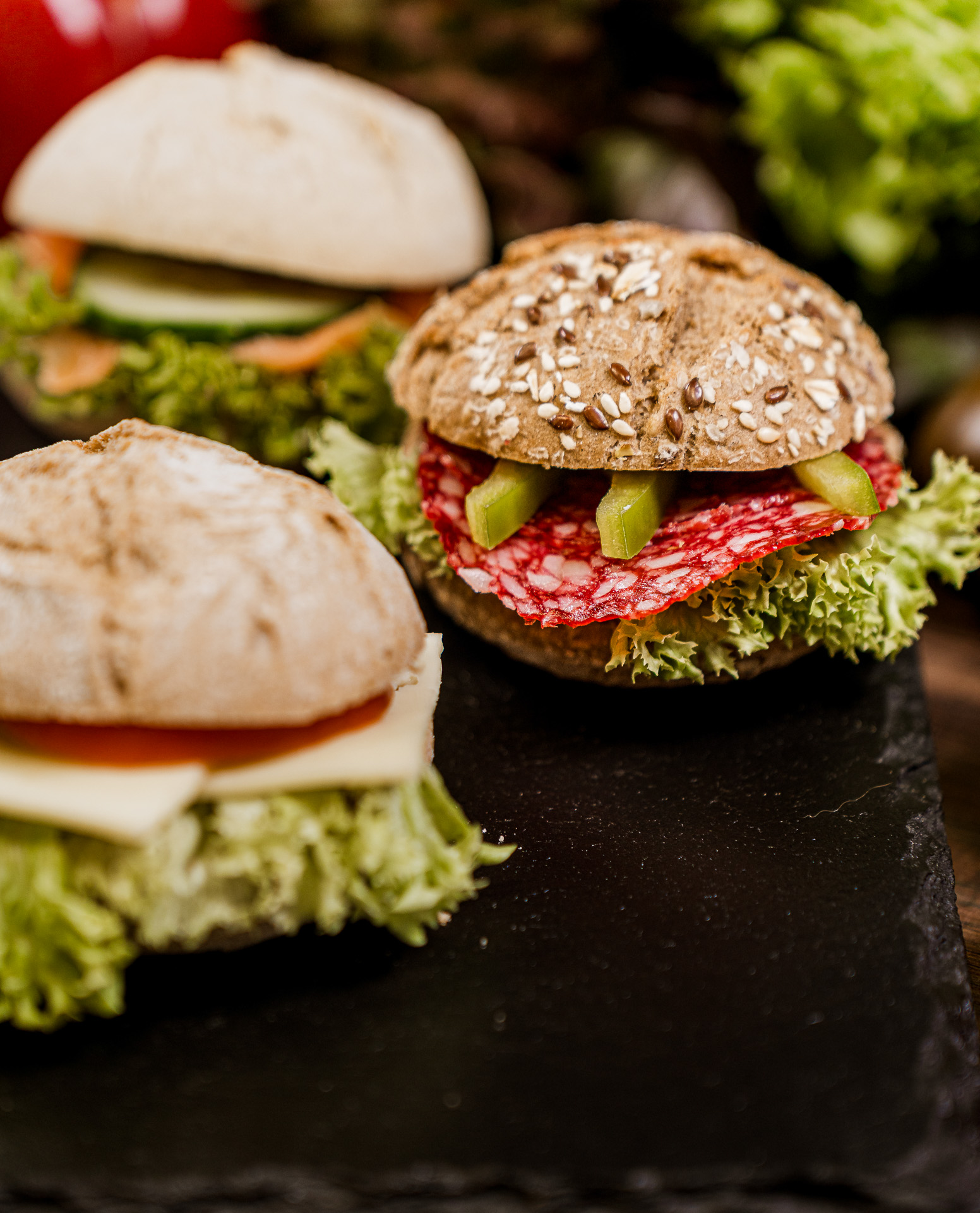 Gouda · Spanische Salami · Lachs · Ei Dekoriert mit Salat und frischem Gartengemüse der Saison.