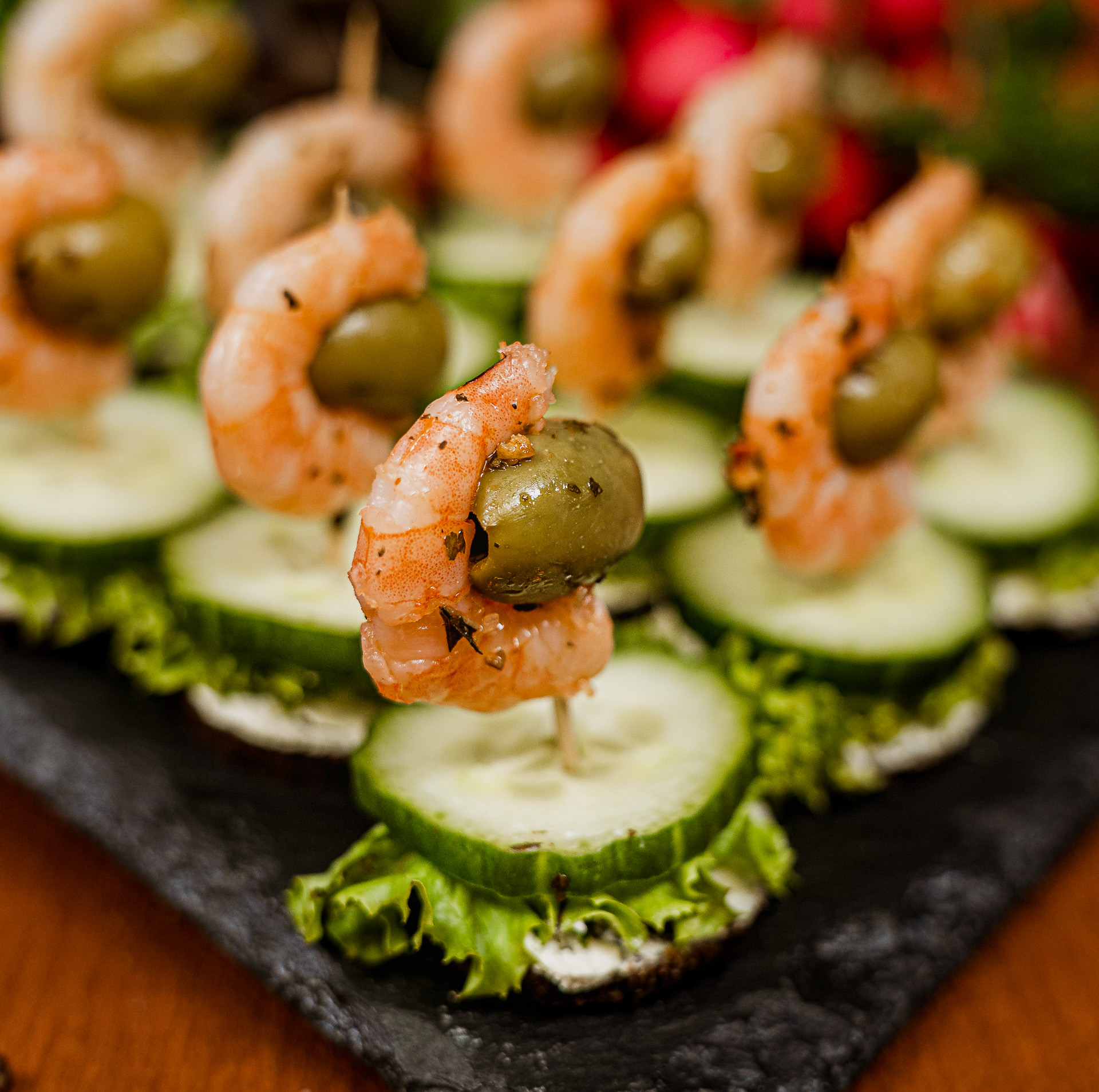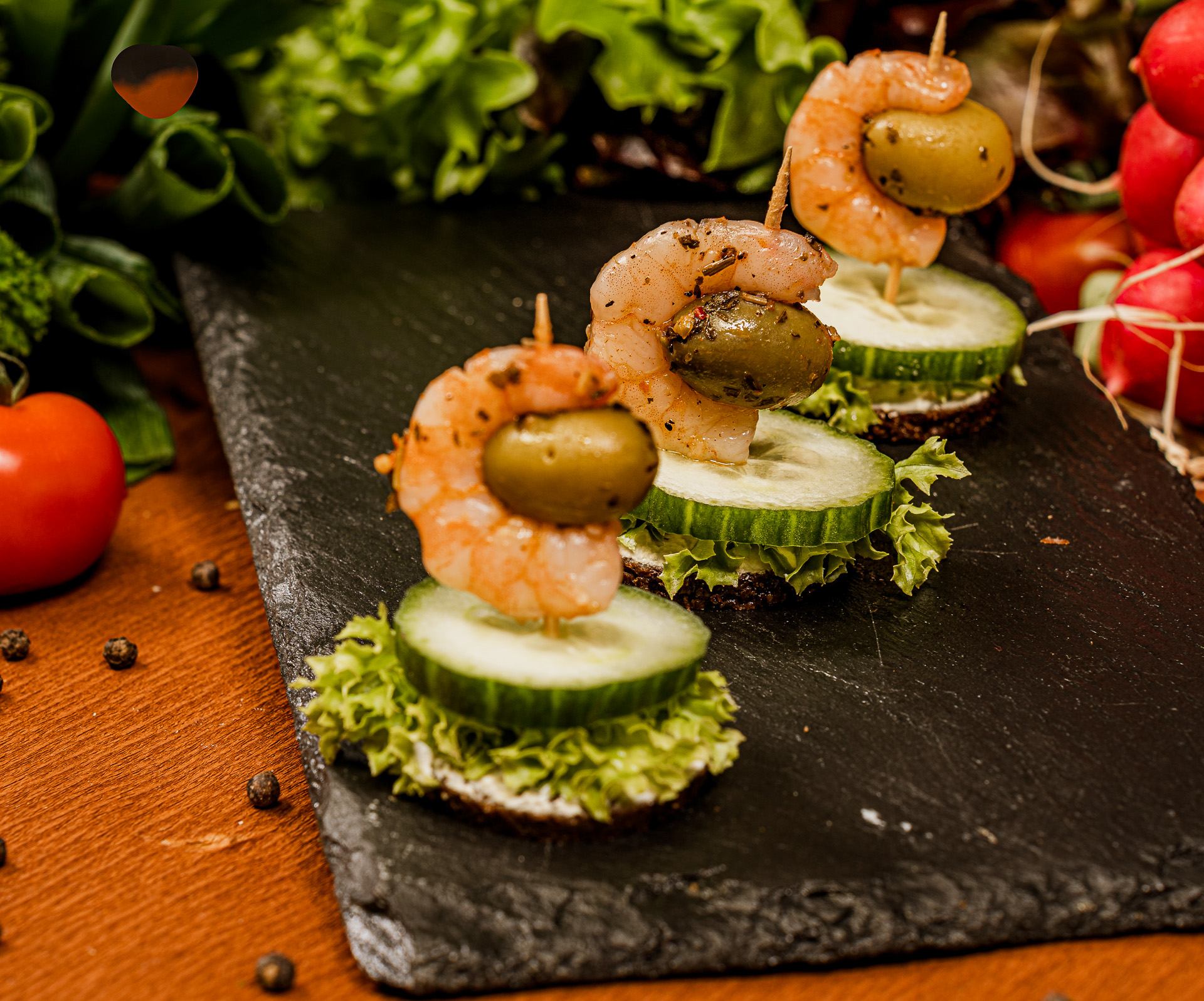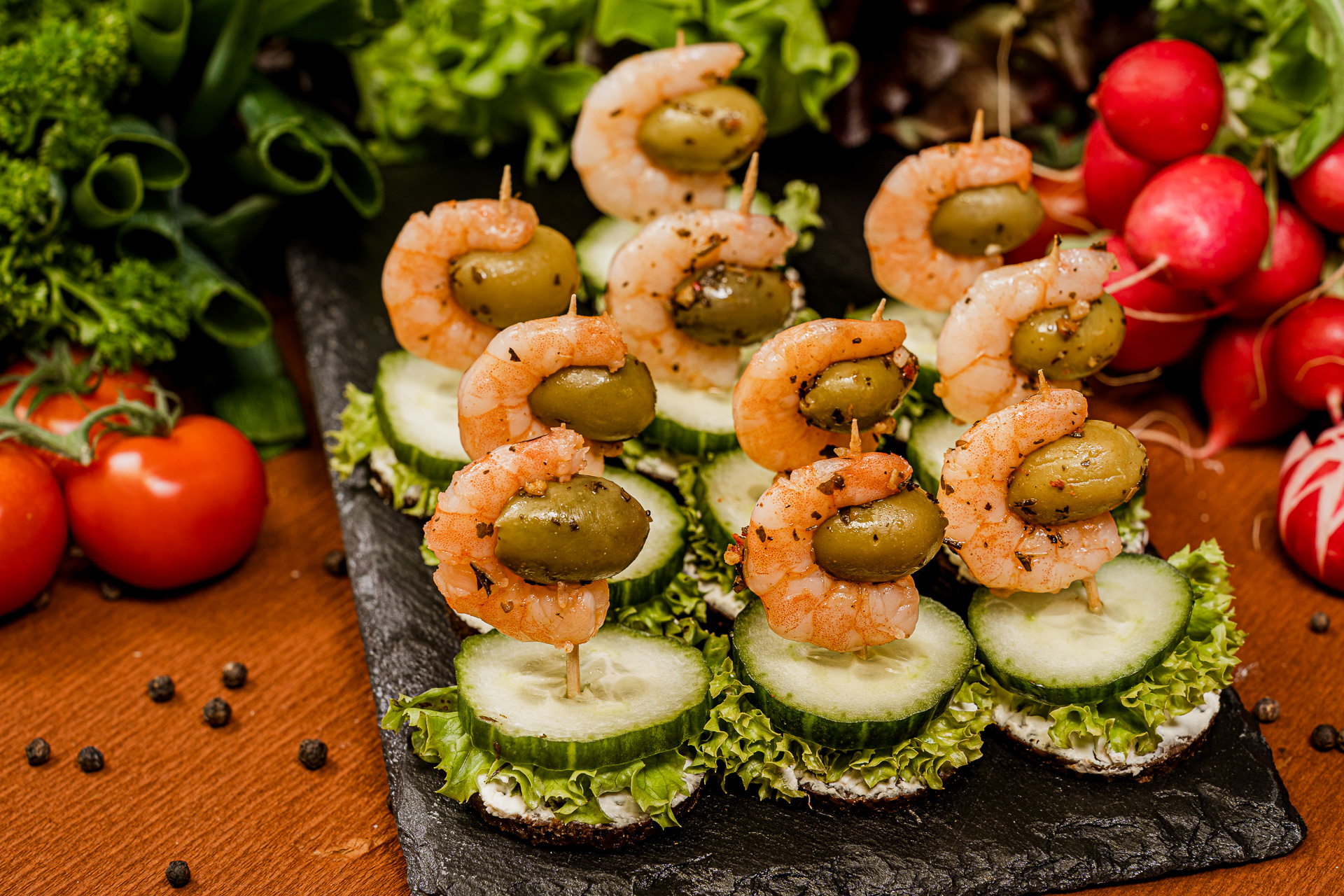 Frischkäse · Salat dazu frische Gurke, Olive und Garnelen am Spieß