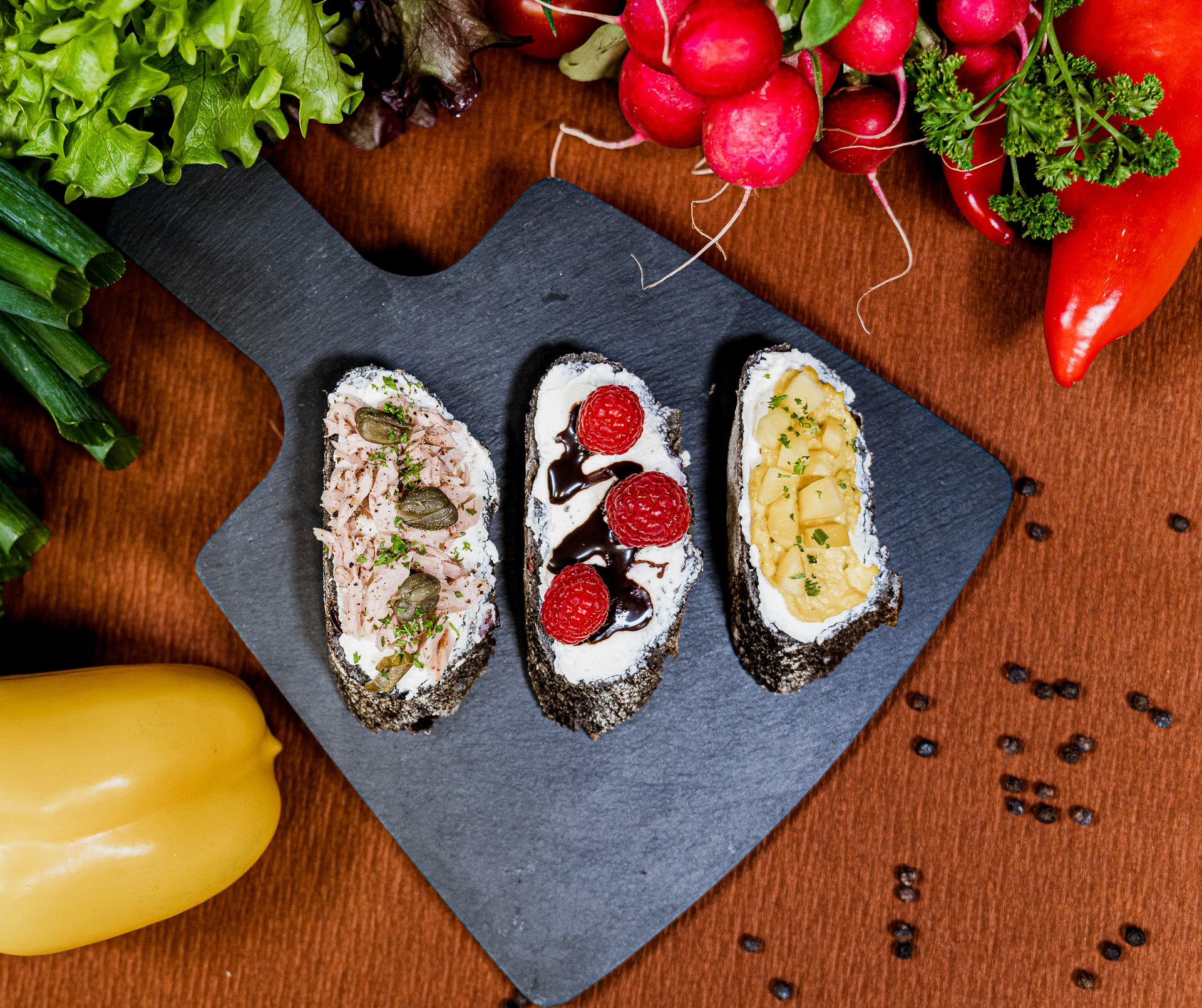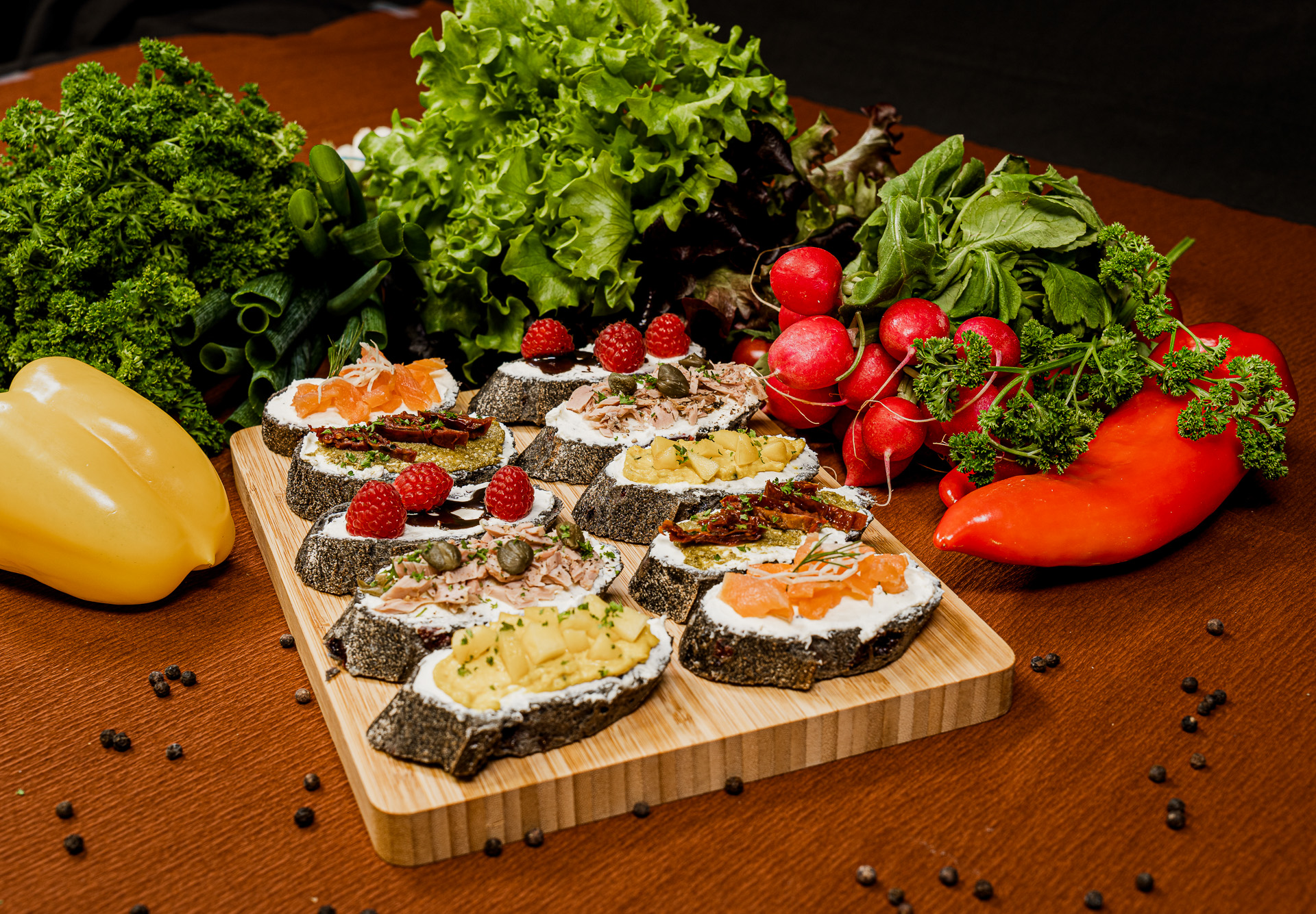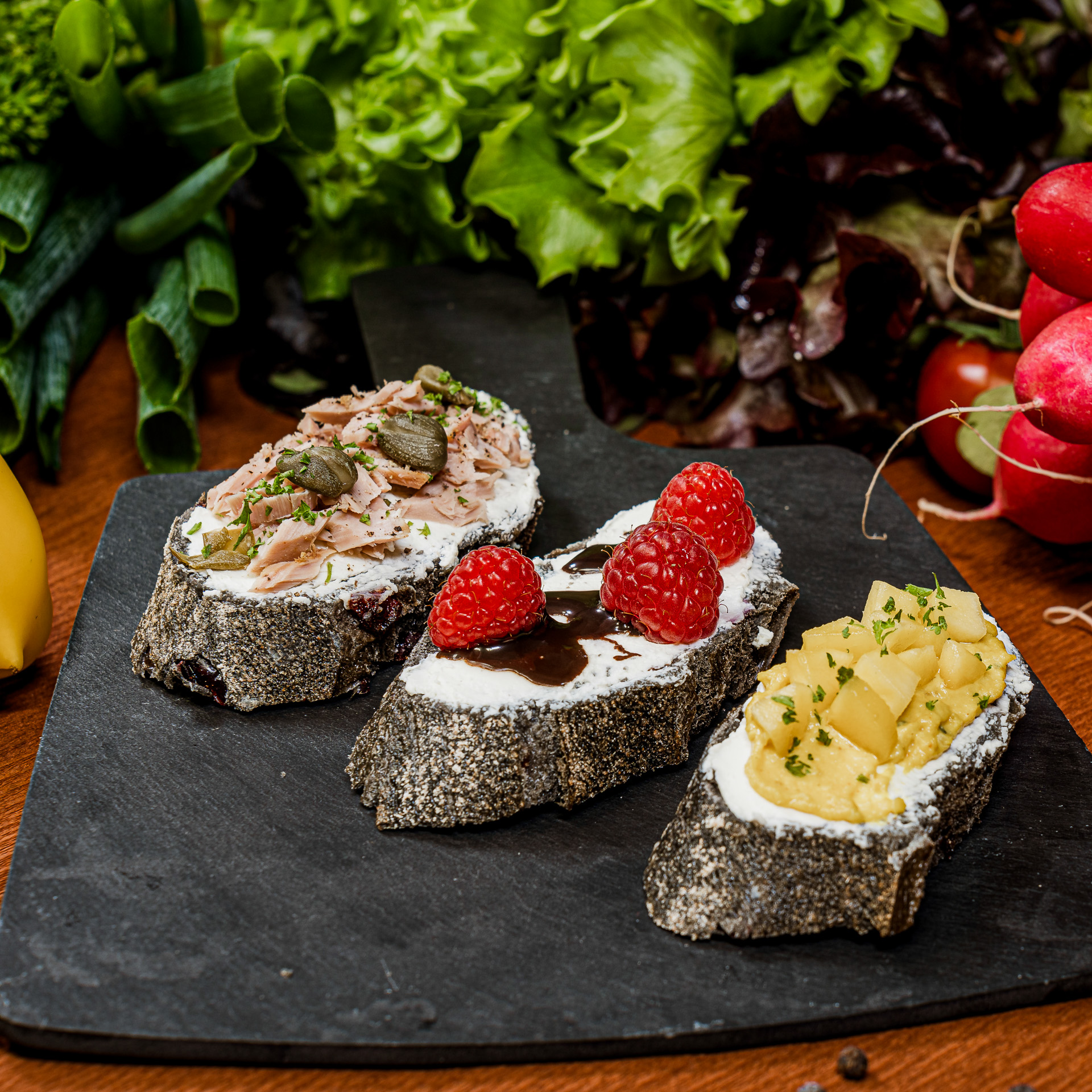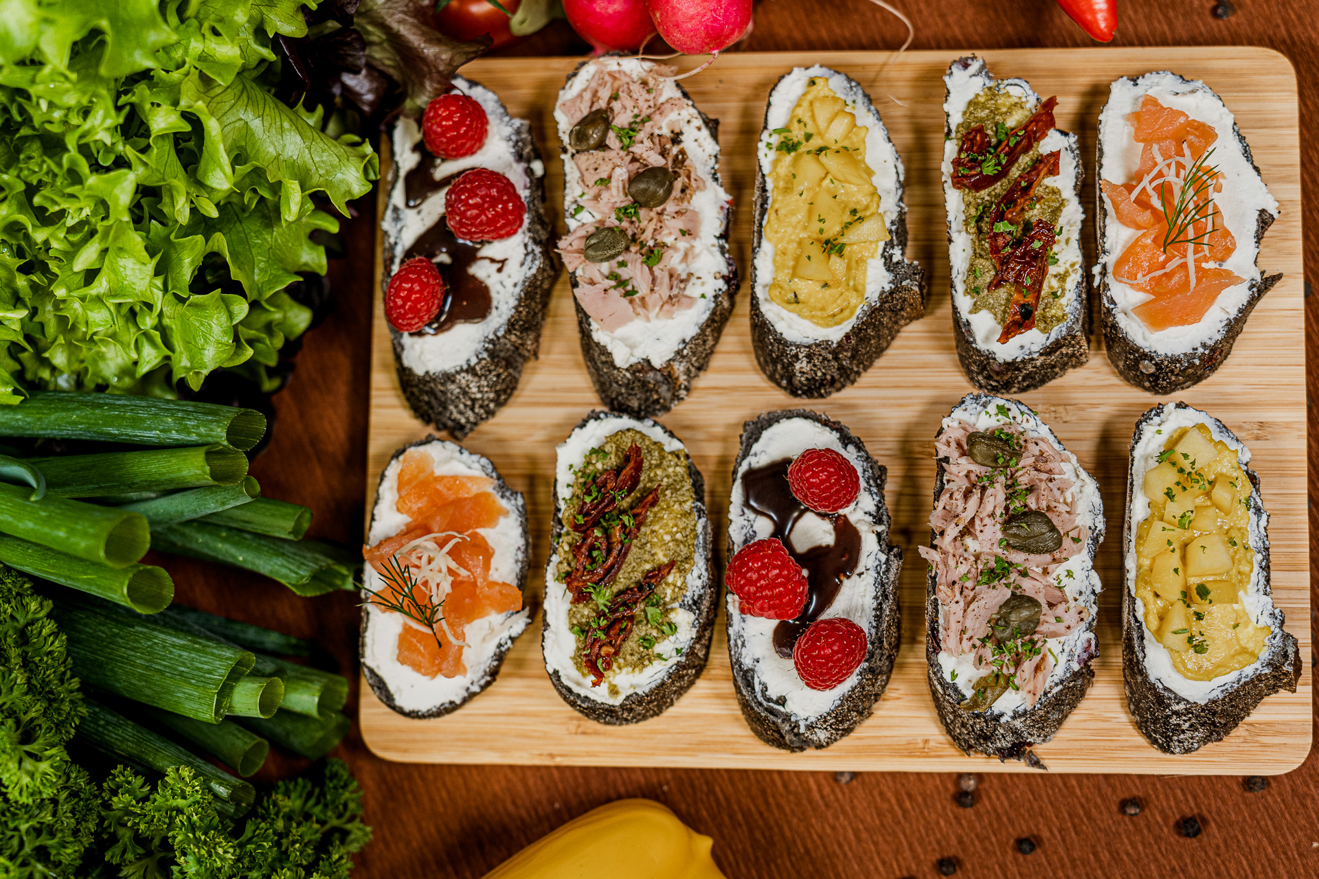 dazu Räucherlachs mit Meerrettich · Curryhumus mit Mangostückchen · Thunfisch mit Kapern ·Pesto mit getrockneten Tomaten · Schokosauce mit Himbeeren