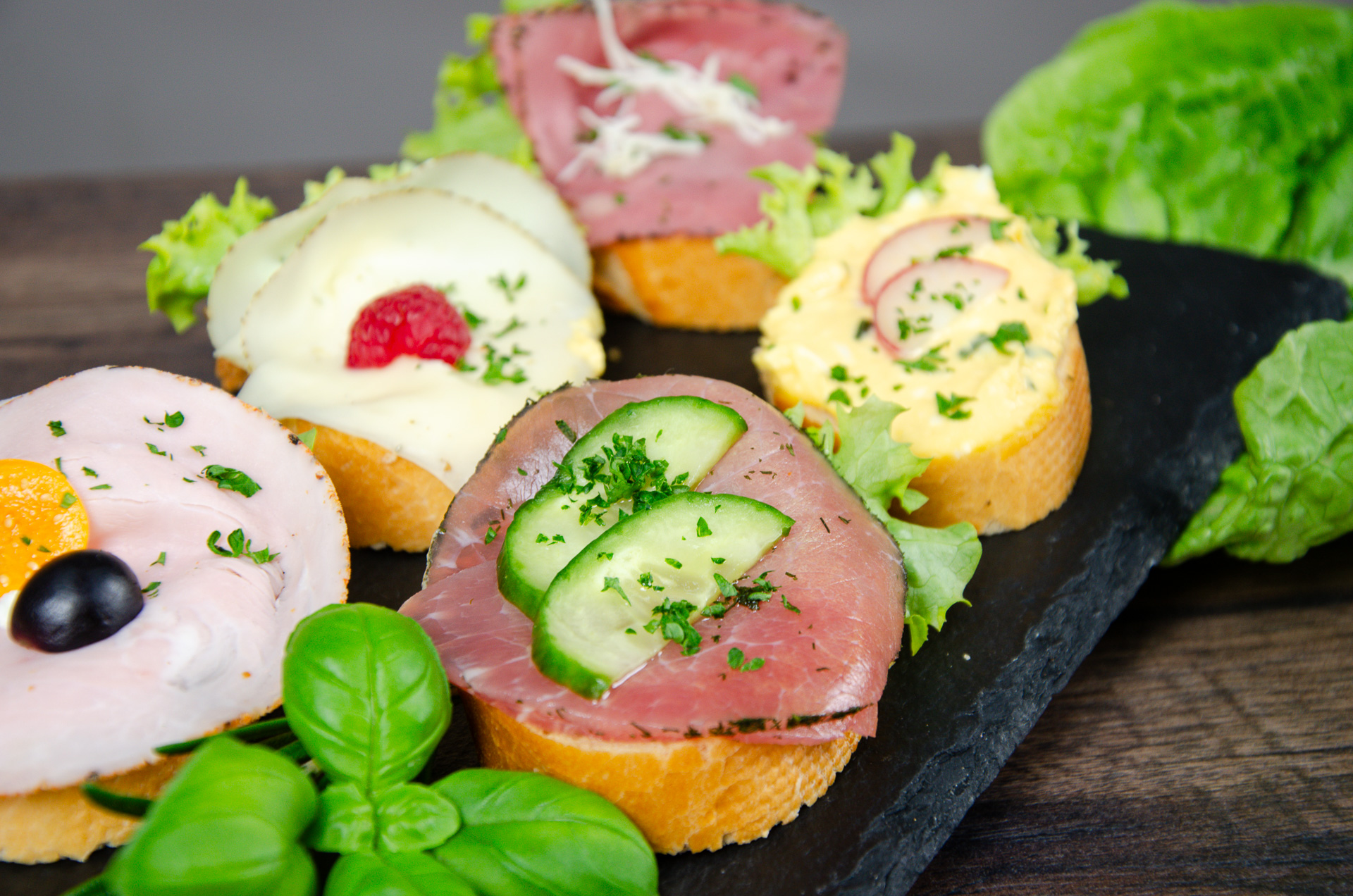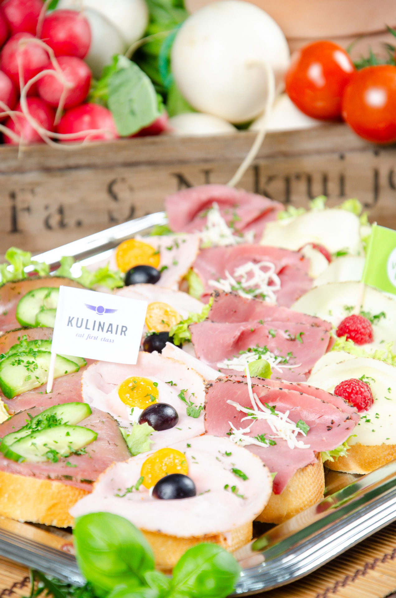 Pastrami ∙ Fol Epi Rosmarin ∙ Craved Lachsfleisch ∙ Schinken mit Belem Pfeffer ∙ EisalatDekoriert mit Salat, frischem Gartengemüse und Obst der Saison.