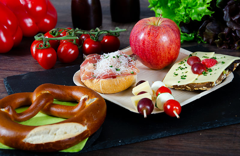 1 helles Brötchen belegt mit Schinken1 dunkles Brötchen belegt mit Käse1 Elsass-Spieß - mit Trauben und Käse1 Toskana-Spieß - mit Tomate, Mozarella, Basilikum1 Butterlaugenbrezel1 Apfel