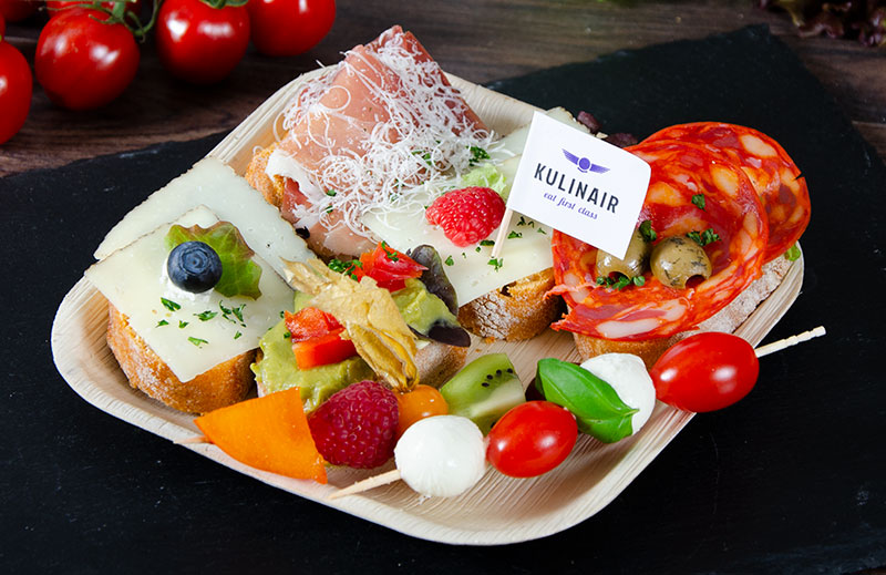 Serranoschinken, Chorizosalami, Manchego-Käse, Trufa-Negra-Käse (schwarzer Trüffelkäse), Guacomole1 Karibik-Spieß - Obstspieß mit frischen Früchten der Saison1 Toskana-Spieß - mit Tomate, Mozarella, Basilikum