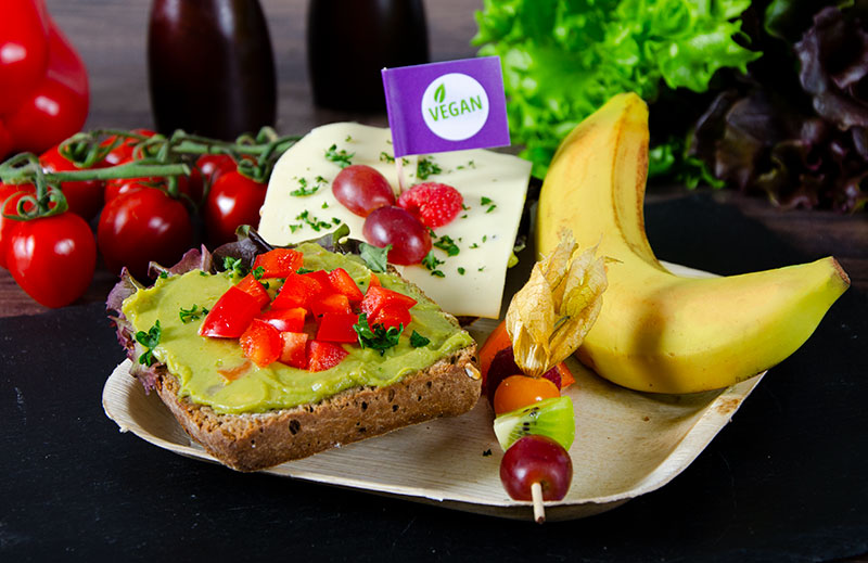 2 dunkle Brötchen belegt mit verschiedenem veganen Belag1 Karibik-Spieß - Obstspieß mit frischen Früchten der Saison1 Banane